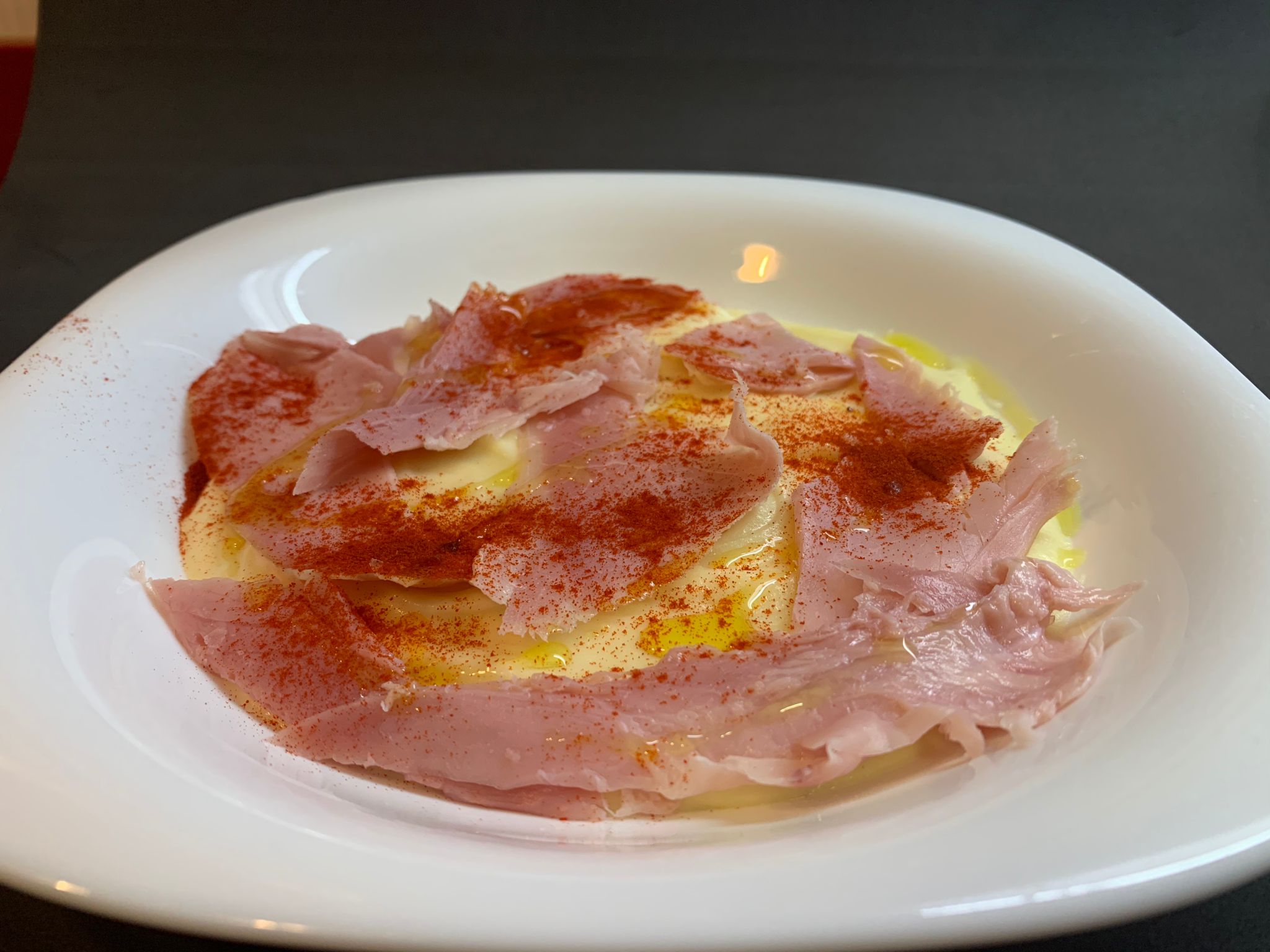 SUGERENCIA: Yo reservé la emulsión de patata en un plato en vez de la manga pastelera y lo serví con lacón. PUEDES VER EL VIDEO QUE ADJUNTO.