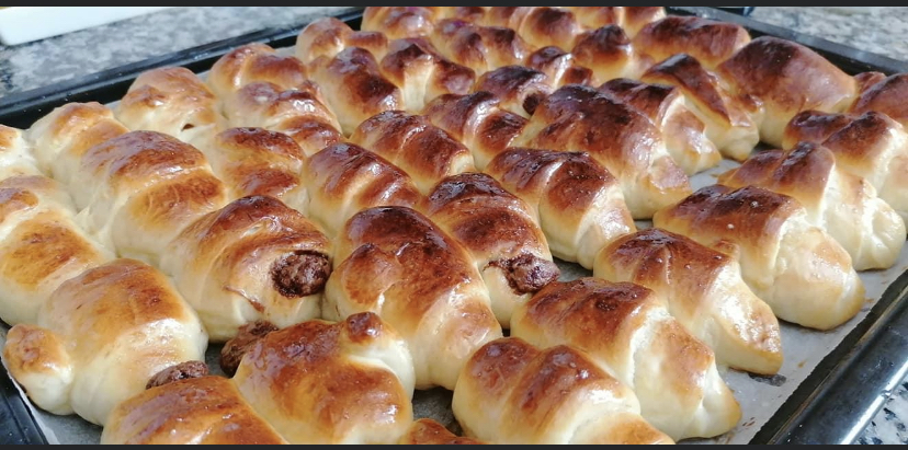 En mi caso estuvo unas 3 horas aprox. porque puse menos levadura, desgasificamos la masa sobre la mesa levemente enharinada, extendemos en forma rectangular ( 30 x 45 cm aprox.), a medio cm de espesor, cortamos a la mitad con un cuchillo afilado modo guillotina, formando dos rectángulos de 15x40 cm aprox. Cortamos triángulos largos y enrollamos desde la parte más ancha como si fuesen Croisants, la masa se va estirando a medida que la enrollamos. Armamos las medialunas, metiendo hacia dentro las puntas. Colocamos en una bandeja con papel vegetal o en un silpad tocándose unas con otras. Dejamos leudar nuevamente hasta que se unen y pintamos con huevo batido. Precalentamos el horno a 200º C, al meter la bandeja bajamos a 180ºC y horneamos unos 25 minutos. En caliente pintamos con el almíbar que preparamos mientras se hornean.