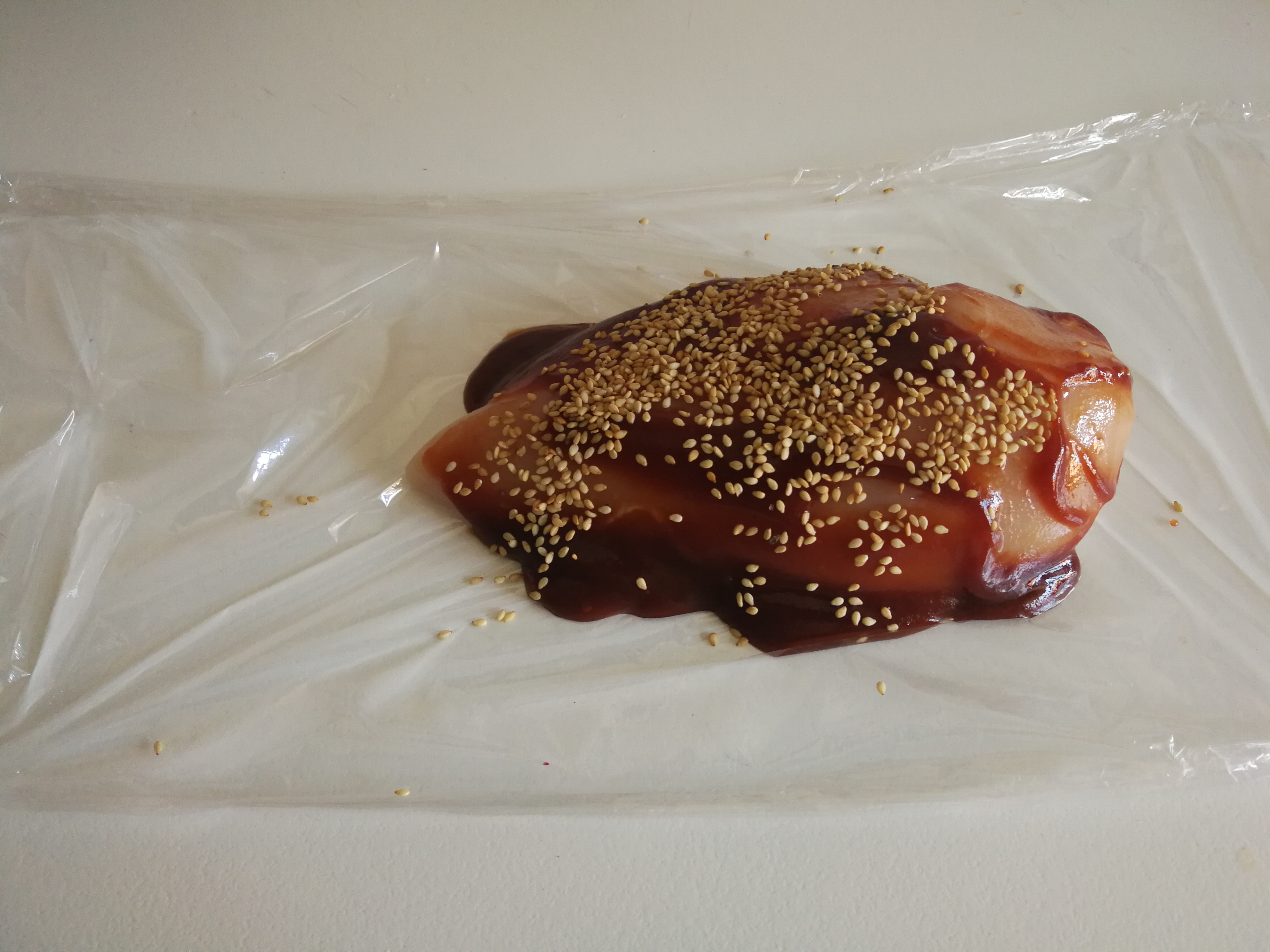 - Coloca la pechuga sobre un cuadrado de film transparente y úntala con la salsa barbacoa. Espolvorea con las semillas de sésamo y cierra el film enrollando los extremos. Coloca la pechuga en el recipiente Varoma. Tapa y reserva.