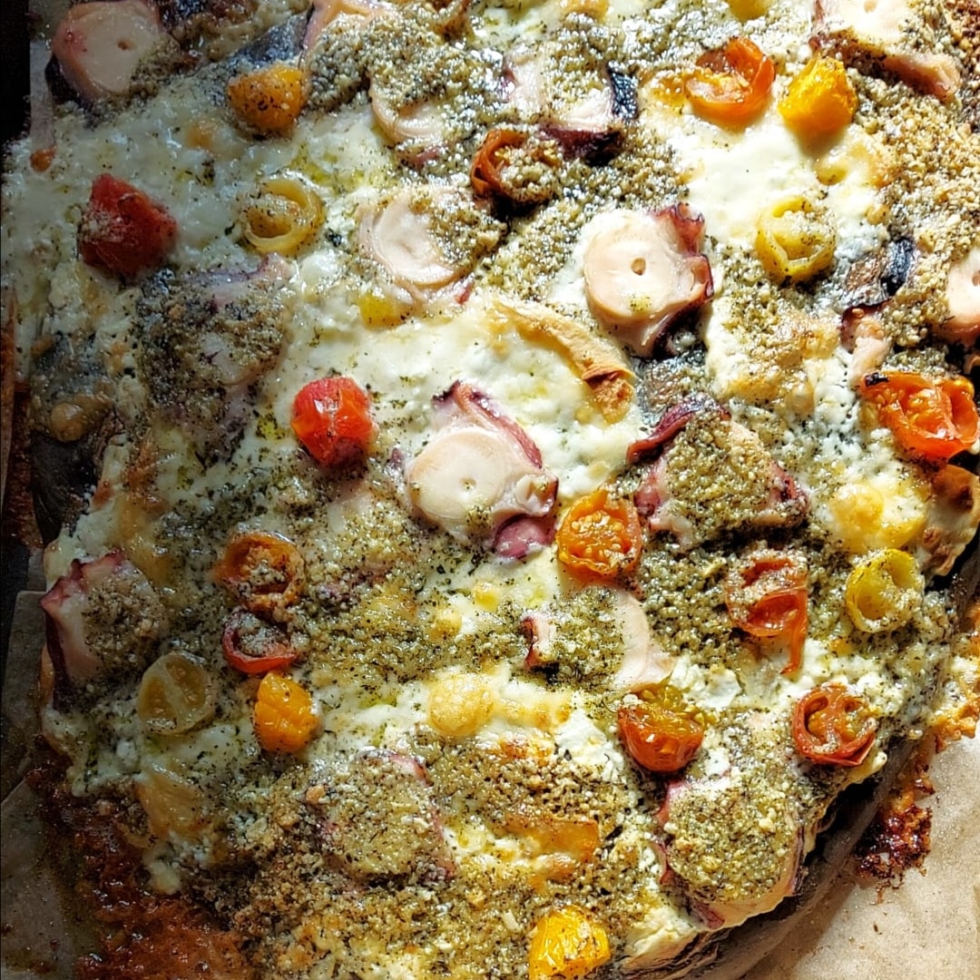 Pizza Nero di sepia con pulpo y pesto de almendra
