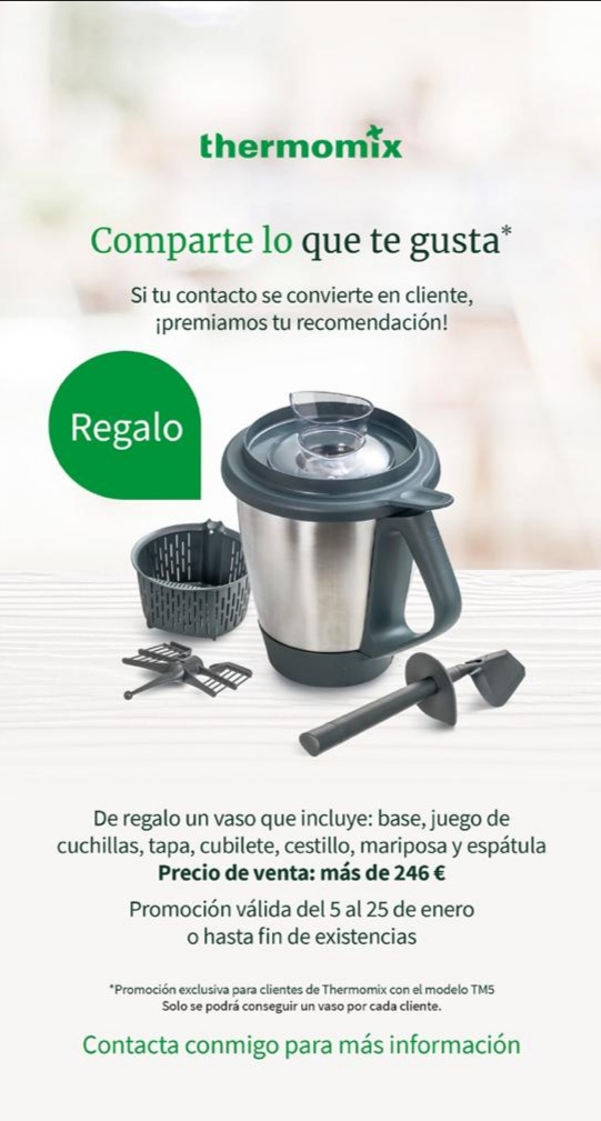 Que crees que es una inocentada?, pues no. Has leído perfectamente. Si me facilitas un contacto que compre el Tm6, Thermomix te mandará un vaso nuevo de Tm5 completo totalmente gratis, que viene siempre genial, cuyo valor es de 246.70€