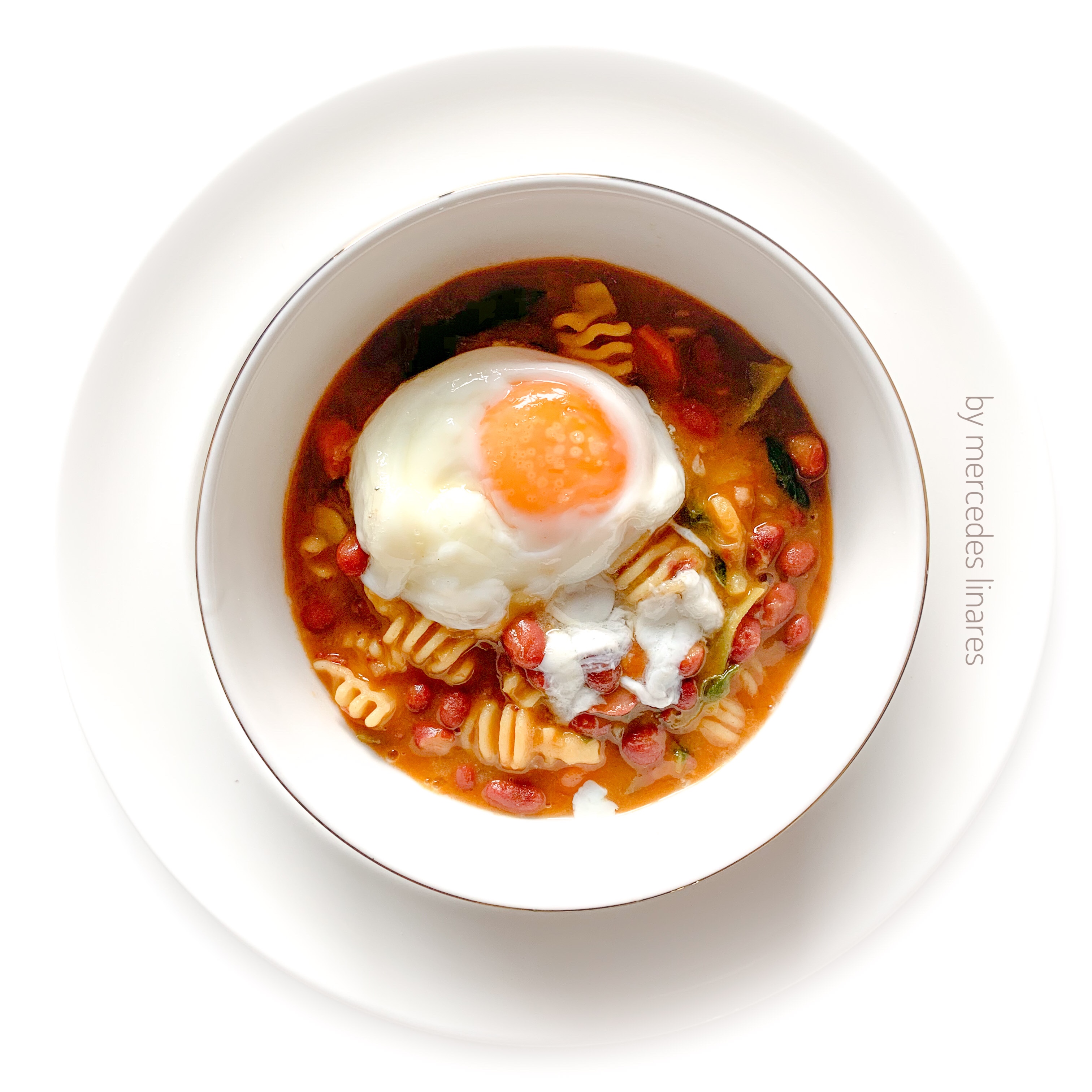 - Añada al vaso las judías de la bandeja Varoma y mezcle con la espátula. Deje reposar mientras quita el film a los huevos. Distribuya el potaje en 6 platos hondos y sirva con los huevos.