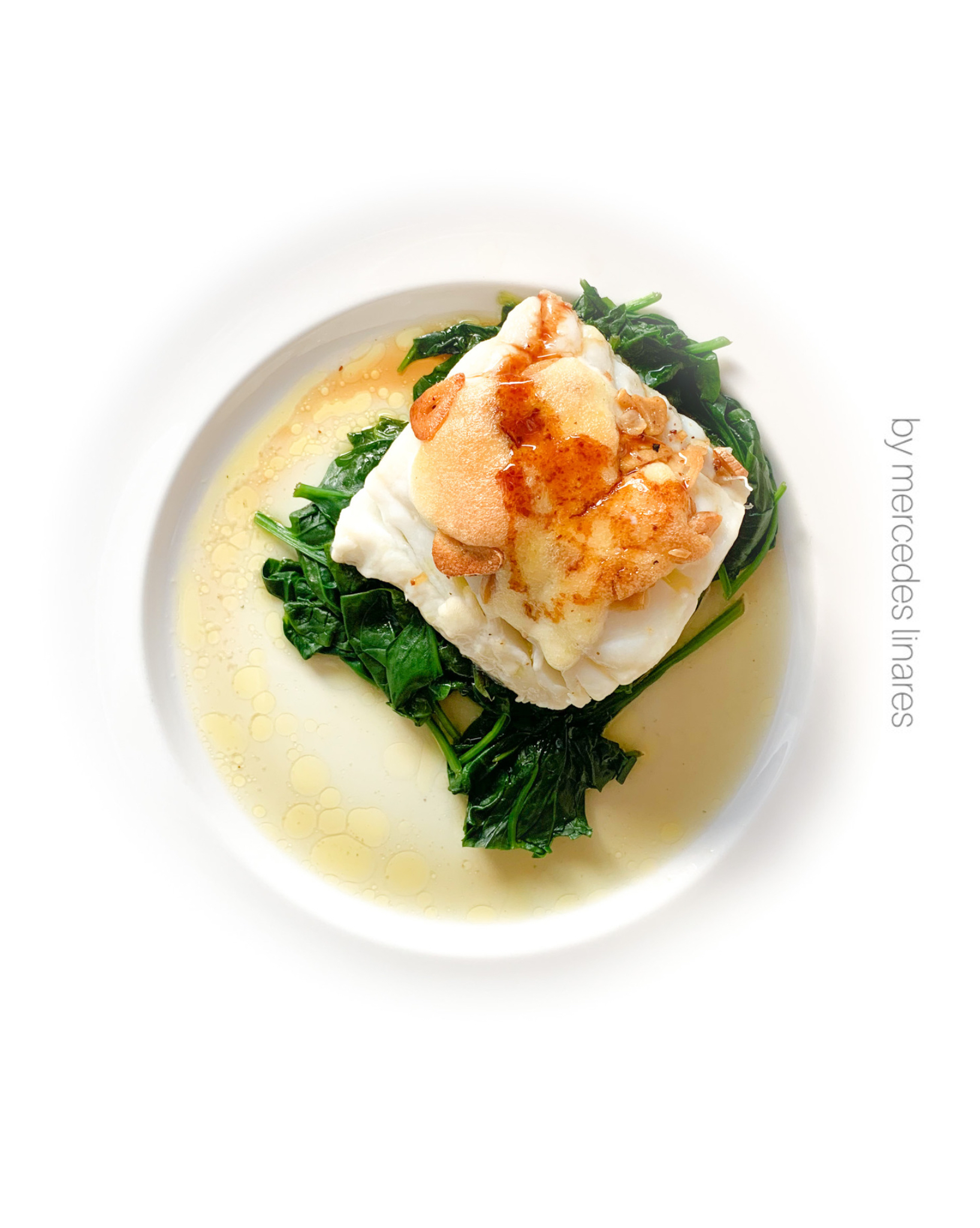Ponga las hojas de espinacas en el fondo de una fuente para servir, coloque encima los lomos de bacalao, decore con unos hilos de caramelo líquido y sirva inmediatamente.